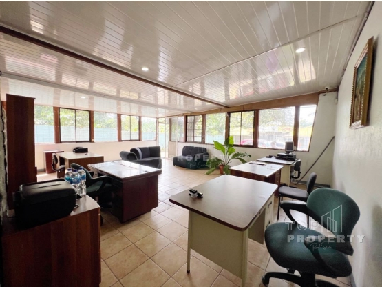 Espaciosa oficina de aproximadamente 80m2, cuenta con un amplio espacio para oficina, un sanitario y en la parte de atrás posee una zona muy funcional como bodega, y un área de fregadero, además cuenta con un amplio parqueo muy amplio.